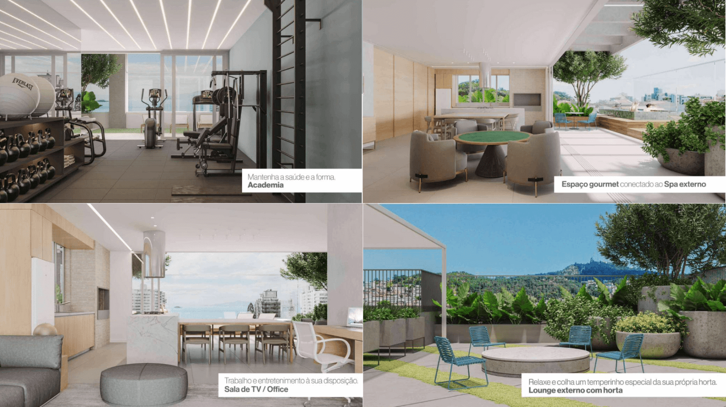 Estrutura para reaproveitamento de água, paisagismos vertical e áreas de lazer favorecendo iluminação natural.